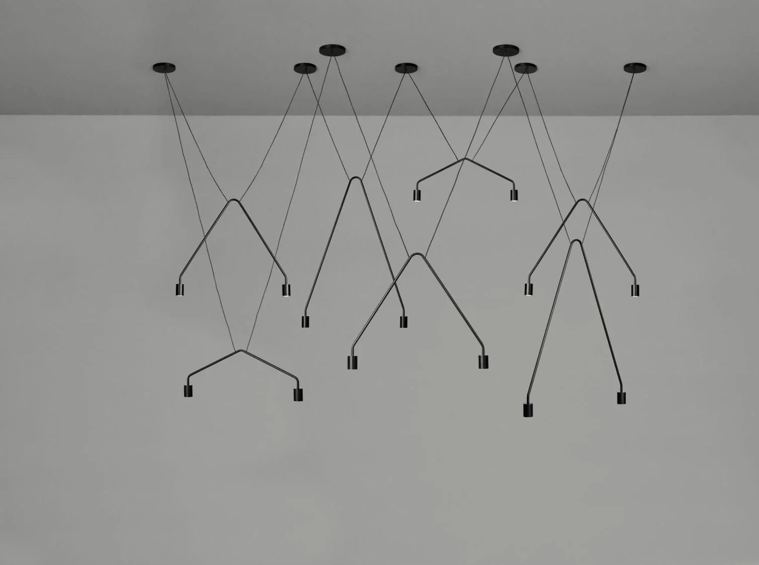 Dal dialogo tra la flessibilità del cavo e la rigidità del tubolare prendono forma configurazioni sempre diverse: lampade a sospensione o da soffitto, simmetriche o asimmetriche, strutture leggere che sembrano fluttuare nell’aria, sospese da fili quasi invisibili.